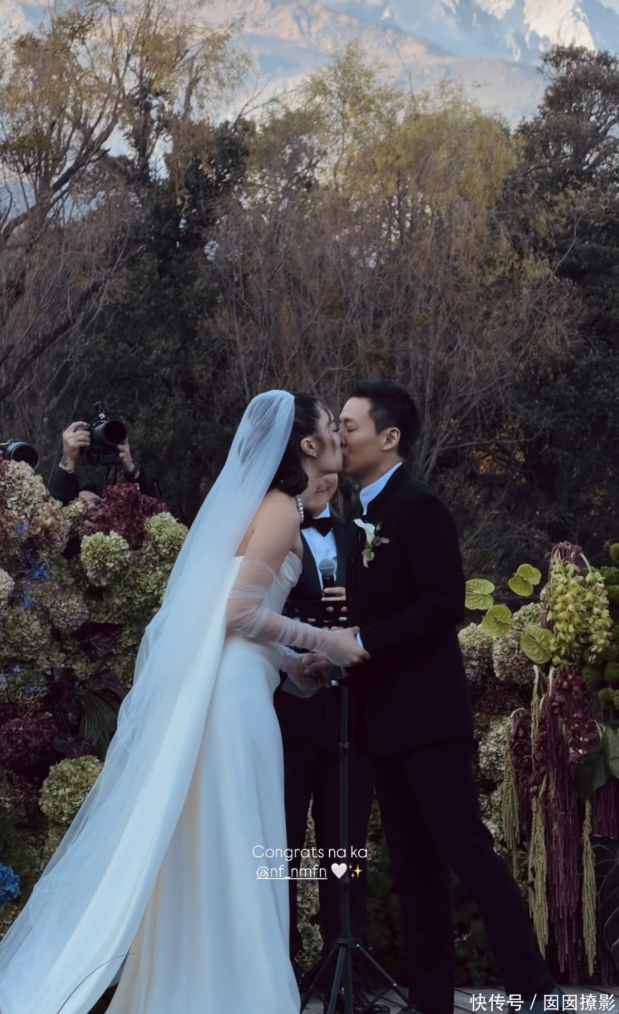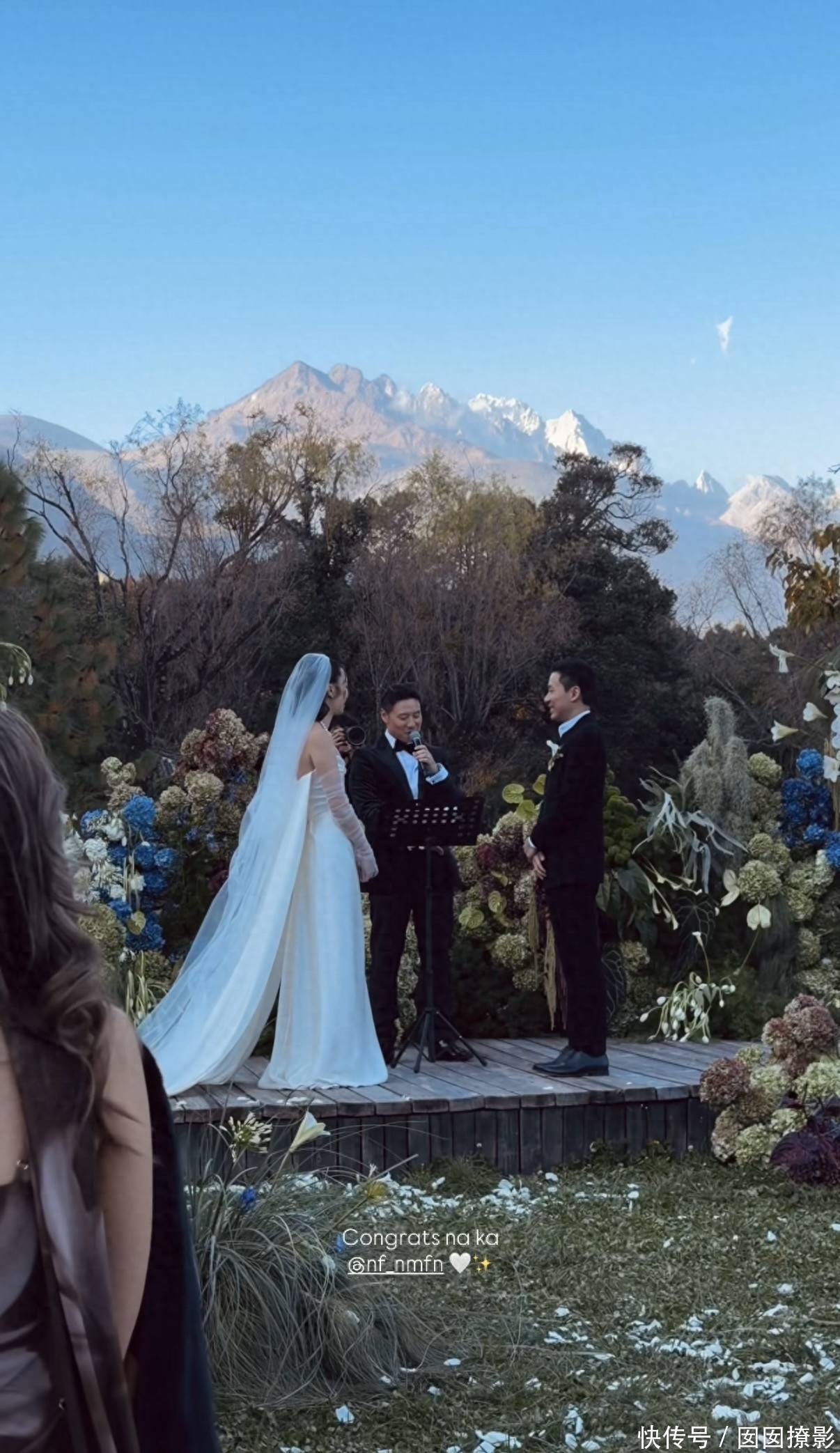 霍启仁与妻子Namfon现身云南丽江,在当地的雪山下举办婚礼。从被曝光的照片来看,婚礼分为室外以及室内场地,而且连办了几日,因为大多宾客都是从泰国来的,所以在婚礼举办前还安排了特别的活动,比如看表演,骑马等。在婚礼当天,白天是户外婚礼,在雪山脚下的户外,还举办了婚礼仪式,现场特别精心布置了一番,被各种花束所包裹着。Namfon身穿白色的抹胸婚纱,霍启仁身穿黑色西装,两人在众多亲友的见证下,在台上宣读誓词,之后还热情相拥。