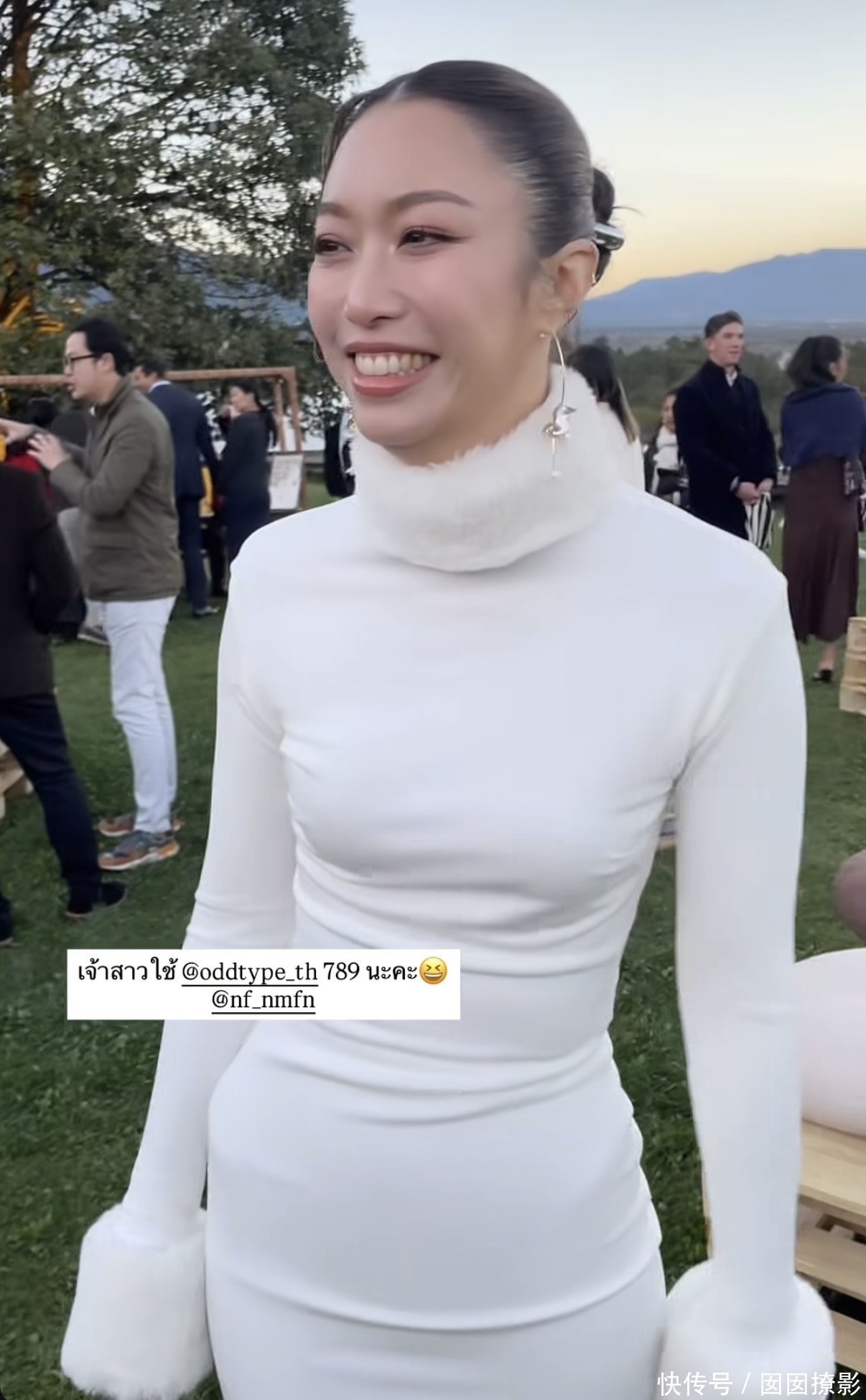 在婚礼仪式结束后,又举办了户外的酒会。由于是下午的户外酒会,天气渐渐变得寒凉起来,所以Namfon身穿一条白色的贴身长裙,领口与袖口都有一圈毛茸茸的装饰,以此用来防寒保暖,不过景色很优美,尤其在户外,看得到远处的雪山还有蓝天。Namfon在酒会现场忙着招呼宾客,到场的都是她在泰国的朋友,所以显得十分放松、自在。